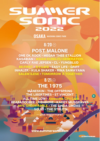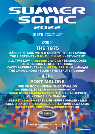 THE 1975、POST MALONE、CARLY RAE JEPSEN、CL、THE LIBERTINES、MAN WITH A MISSION、MÅNESKIN、MEGAN THEE STALLION、ONE OK ROCK、THE OFFSPRING、PRIMAL SCREAM present Screamadelica Live、ST.VINCENT、YUNGBLUD、WANIMA、ALL TIME LOW、BEABADOOBEE、BLUE ENCOUNT、CHAI、EASY LIFE、FISHBONE、GRIFF、INHALER、女王蜂、KACEY MUSGRAVES、KULA SHAKER、THE LINDA LINDAS、Novelbright、RINA SAWAYAMA、SQUID、THE STRUTS、優里、Vaundy