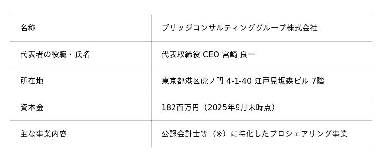 ブリッジコンサルティンググループ株式会社についてブリッジコンサルティンググループは、「公認会計士の経験・知見・想いを集約し、最適配分を可能にするプラットフォームを創る」をコーポレートミッションとした、公認会計士等に特化したプロシェアリング事業を展開するコンサルティング会社です。