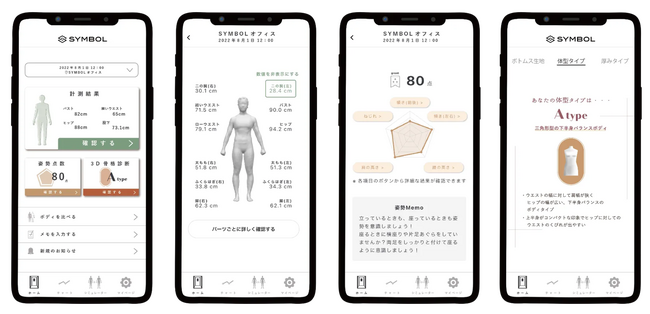 また、SYMBOL社が独自に開発した解析アプリ「MyRealBody(R)」により、お客さま自身の3Dアバターを生成し、4つの体型から判定する「3D骨格診断」などの内容をもとに、体型に合わせた美しく見えるスーツデザインをレコメンドし、デザイン選定におけるお客さまの悩みを解消します。