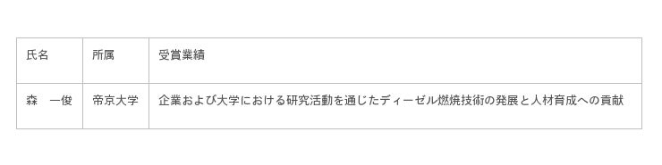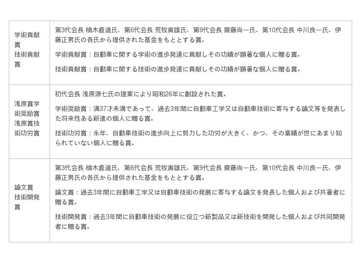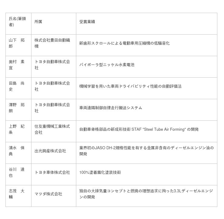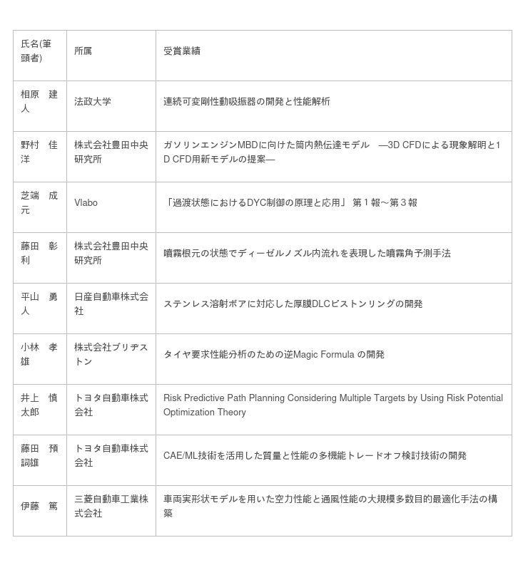 自動車技術会賞は、1951年に自動車工学および自動車技術の向上発展を奨励することを目的として設けられ、自動車技術における多大な貢献・功績に対し贈呈しています。第73回の受賞者は、次の通りです。