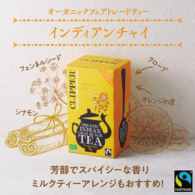 有機紅茶に、有機スパイスのシナモン、クローブ、フェンネルシードをブレンド。独特の香り、爽やかなオレンジがアクセントの芳醇でスパイシーな風味。そして澄んだ色合いが爽快さを醸し出します。