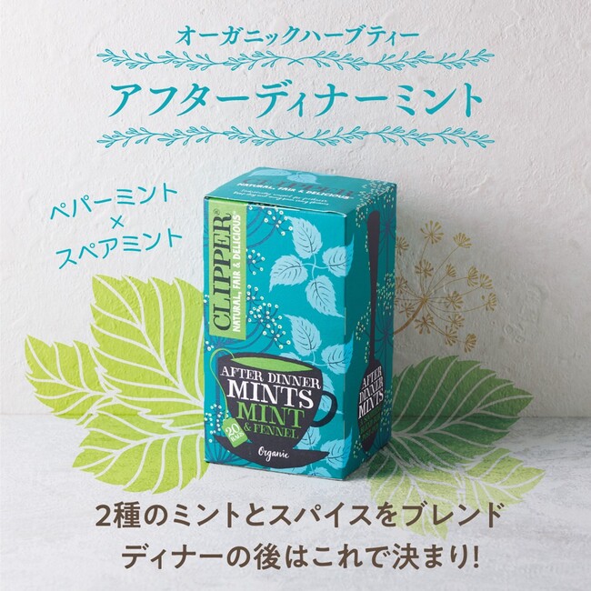 爽やかなペパーミント、ほんのり甘いスペアミントに、フェンネルとジンジャーのスパイシーテイストをバランスよく合わせたカフェインフリーの有機ハーブティー。
