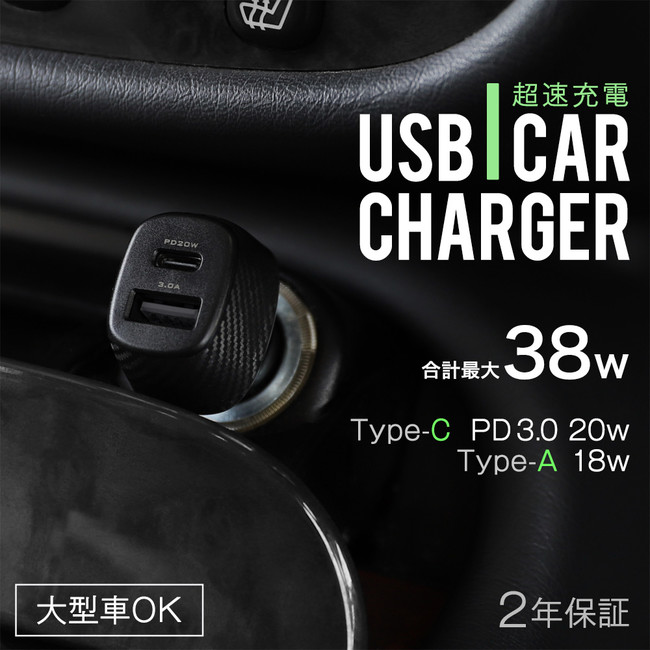 ◆ Type-C(PD20W)×1+Type-A(最大18W)×1 合計最大38W 車載充電器 「OWL-CPD20C1A1-BK」