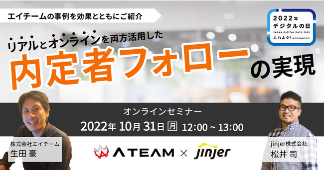 バックオフィス向けクラウドサービス「ジンジャー」を提供するjinjer株式会社(本社:東京都新宿区、代表取締役CEO:加藤 賢、以下jinjer)は、株式会社エイチームをお招きして、「リアルとオンラインを両方活用したハイブリッドな内定者フォローの実現」というタイトルに基づき、セミナーを2022年10月31日(月)に開催することをお知らせいたします。