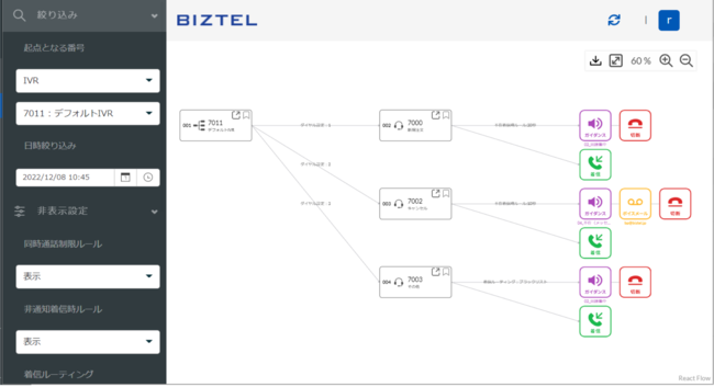 図に表示されている設定内容をクリックすることで個々の設定画面にアクセスでき、変更・修正を効率的に行うことが可能です。また、コールフロー図はダウンロードでき、社内での共有も簡単に行えます。