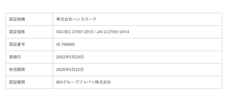 企業向けアルムナイ専門サービスシェアNo.1(*1)の『Official-Alumni.com(オフィシャル・アルムナイ・ドットコム)』を提供する株式会社ハッカズーク(本社:東京都、代表取締役CEO 鈴木仁志 以下ハッカズーク)は、セキュリティ対策強化の一環として、情報セキュリティマネジメントシステム(ISMS)の国際規格である「ISO/IEC 27001:2013 / JIS Q 27001:2014」に基づくISMS認証を取得しました。