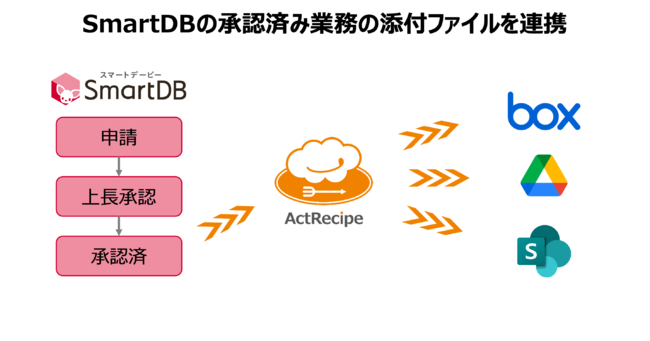 本発表に合わせまして、「SmartDBで承認を終えた業務の添付ファイルを各種クラウドストレージに保存するレシピ」をActRecipeのFreeプラン(β)にてリリースしております。