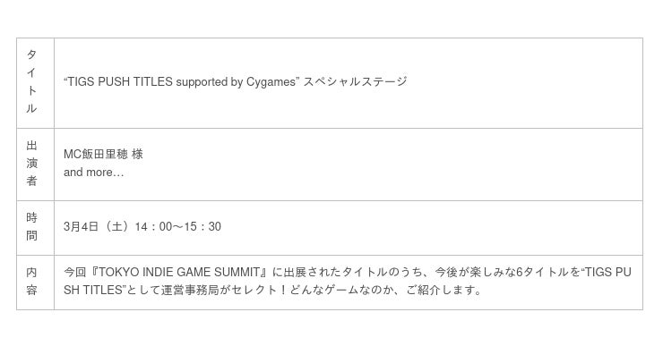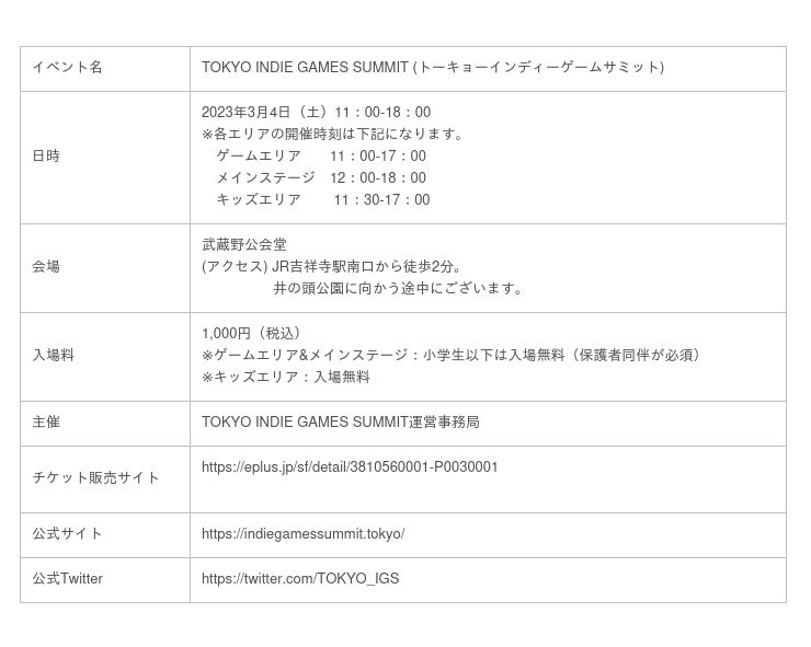 株式会社Phoenixx(フィーニックス)(東京都武蔵野市、代表取締役社長:坂本 和則)は、2023年3月4日(土)に武蔵野公会堂(吉祥寺)で開催するインディーゲームのための新たなイベント『TOKYO INDIE GAMES SUMMIT』(トーキョーインディーゲームサミット)のステージプログラム関連情報、キッズエリア情報、追加出展タイトル、ならびに第四弾ご協賛・ご協力企業様を公開いたしましたことをお知らせいたします。