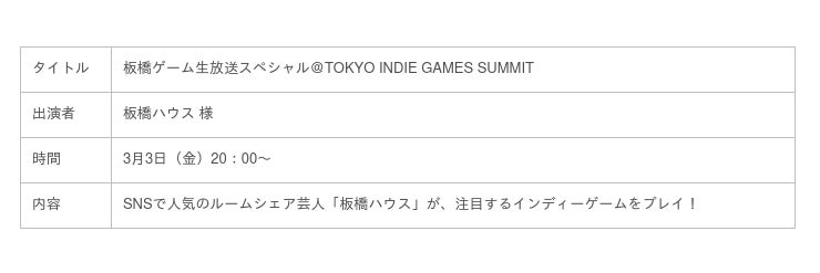 なお、各プログラムの様子は『TOKYO INDIE GAME SUMMIT』公式YouTubeチャンネルにて配信いたします。