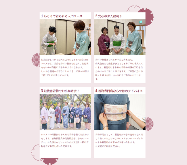 これにより「着方レッスン」に参加するまでの流れ、学ぶことのできる内容、参加にあたりご準備していただきたいもの、「着方レッスン」を行っている店舗の検索ができるようになり、「お試し無料体験のお申し込み」フォームから気軽にお申し込みができるようなりました。