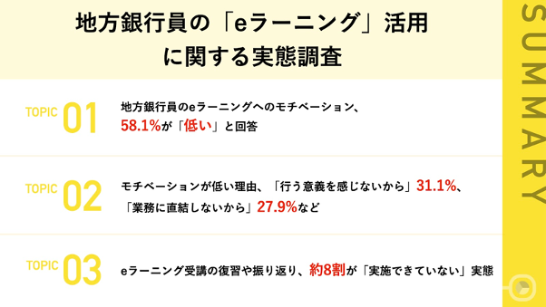 【eラーニング活用に関する地方銀行員の本音調査】eラーニングへのモチベーション、58.1%が「低い」と回答 「行う意義を感じない」「業務に直結しない」などの理由