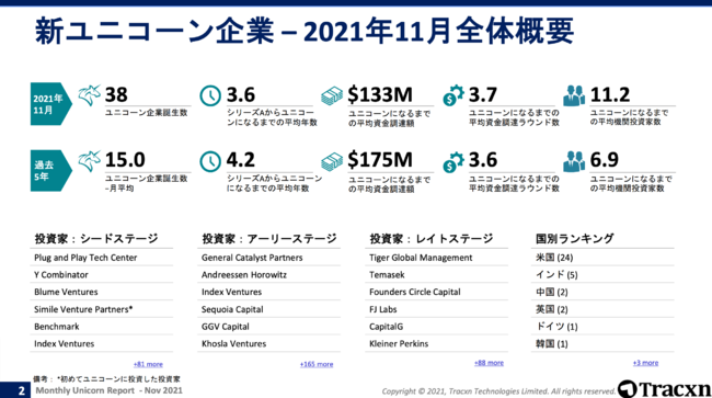 イシン株式会社(本社:東京都新宿区 代表取締役社長:片岡 聡)は、スタートアップデータ分析サービス「Tracxn」による「2021年11月 Monthly Unicorn Report」の日本語訳版をリリースいたしました。