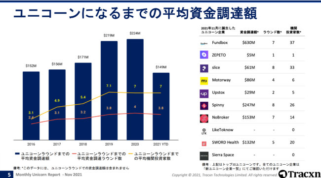 ・2021年11月に新たにユニコーンとなった企業の全体概要(地域・期間・資金調達額など)