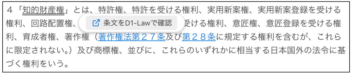 本新機能は、「LAWGUE」上で契約書や規程などの作成・レビュー作業中に、各種法令の条項番号をクリックすると該当の条項内容が別ウィンドウで表示されます。これにより、最新の法令情報を調べる手間が大幅に削減し、ドキュメント作業効率の向上を実現します。