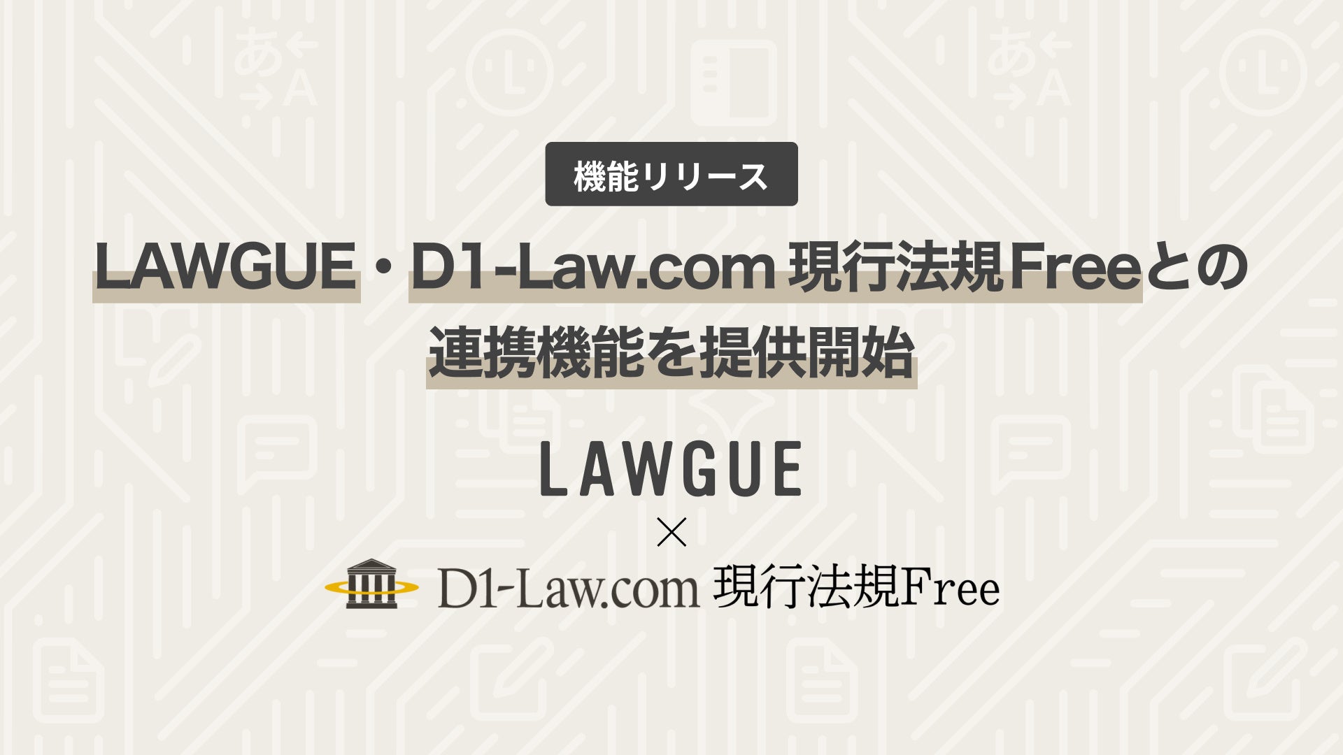 このたび、無料で利用可能な「D1-Law.com 現行法規Free 無料会員」がリリースされたことに伴い、「LAWGUE」でも「D1-Law.com 現行法規Free 無料会員」との連携を開始いたしました。これにより、どなたでも無料で法令リンクから該当法令を確認することが可能となったほか、「法令ウォッチ」機能によりドキュメントに関連する法令が改正された際に通知を受け取れる等、従来有償でのみ利用可能であった機能も無料でお使いいただけます。