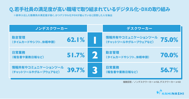 若手ノンデスクワーカーの満足度が高い職場で取り組まれているデジタル化・DXの取り組みの1位は「勤怠管理」。次いで「日常業務」「情報共有やコミュニケーションツール」と、毎日必ず行う業務が上位に