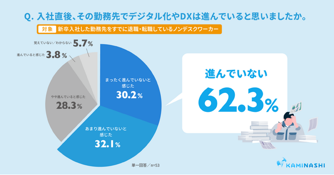 新卒で入社した勤務先を退職・転職済みの若手ノンデスクワーカーの約6割が、その勤務先では「デジタル化・DXが進んでいないと感じた」と回答