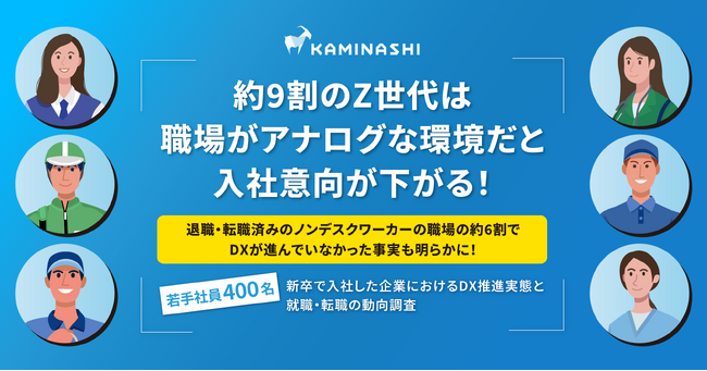 現場DXプラットフォーム『カミナシ』を提供する株式会社カミナシ(本社:東京都千代田区、代表取締役:諸岡 裕人、以下「カミナシ」)は、工場や店舗など主にデスクワークを除く業務に従事しているノンデスクワーカーとデスクワーカーの18歳から27歳の若手社員それぞれ200名、計400名を対象に「新卒で入社した企業におけるDX推進実態と就職・転職の動向」に関する調査を実施しました。