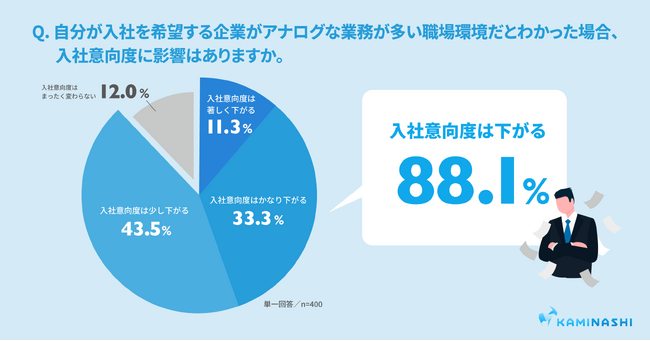 自分が入社を希望する企業がアナログな業務が多い職場環境だとわかった場合の入社意向度への影響について質問したところ、「入社意向度は少し下がる」(43.5%)が最も多く、次いで「入社意向度はかなり下がる」(33.3%)、「入社意向度はまったく変わらない」(12.0%)、「入社意向度は著しく下がる」(11.3%)となり、88.1%の回答者が「デジタル化・DXに取り組んでいない企業に対する就職や転職時の入社意向は下がる」ということが明らかになりました。