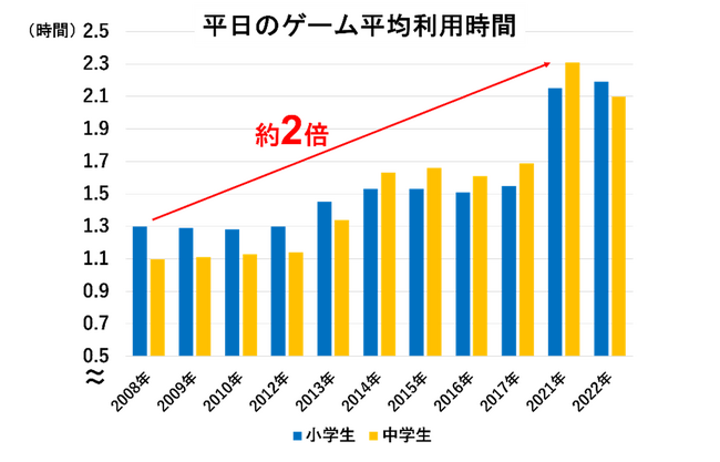「ゲームばかりしていて勉強しない。」これは、スマホが普及する中で、保護者の方からベネッセに寄せられる声です。実際に、小中学生がゲームをする平均時間は平日1日あたり2時間以上(※1)という調査結果もあるなど、ゲームに長時間を費やしていることがわかります。また、ベネッセと東大の調査では、小4〜高3生の学習意欲が4年連続で低下しています。特に小中学生では、ゲームなどのデジタル端末の使用時間が長い子どもほど、学習意欲が低い傾向が見られています(※2)。