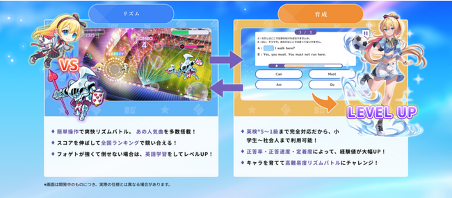 リズムバトルと英語学習が融合した新感覚リズムアクションゲーム。ゲーム感覚で楽しく英語学習が習慣化し、英検(R)5級〜1級レベルの語彙力と文法力が自然と身につく。