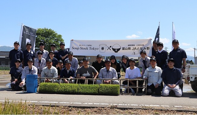 Soup Stock Tokyoで使用している米はすべて富山県砺波市にあるとなみ野農協さんと一緒に作られているコシヒカリ。雪深く、山に囲まれたこの地域は、雪解け水が豊富で、ふっくらとして甘みのある良質なお米がとれる地域です。田植え期の5月と収穫期の9月には、店舗のスタッフとともに産地を訪れ、私たちが店頭でお客様に提供している米の田植えから収穫までを生産者の皆さんと一緒に行なっています。生産者の顔が見える玄米の、特有の香ばしさと甘みをお楽しみください。