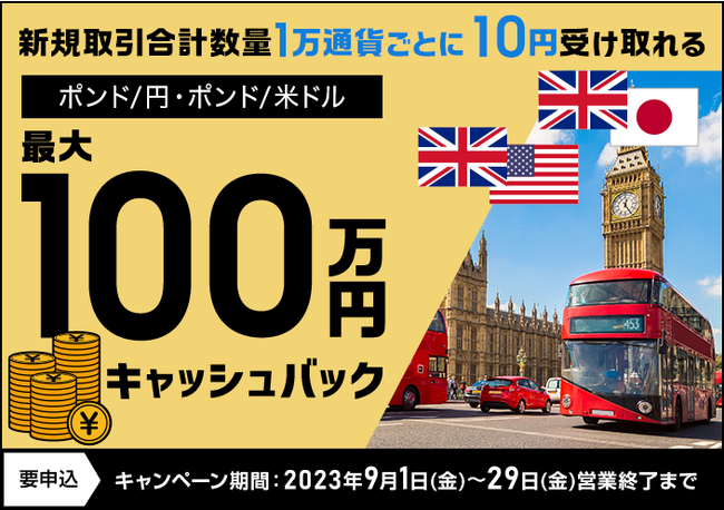 セントラル短資FX株式会社(本社:東京都中央区、代表取締役社長:宮下 俊郎)は、2023年9月1日から29日まで、ポンド/円とポンド/米ドルの新規取引を対象としたキャッシュバックキャンペーンを実施します。