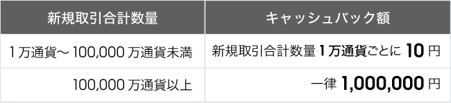 ・新規取引合計数量が5,000万通貨 ⇒ 50,000円キャッシュバック