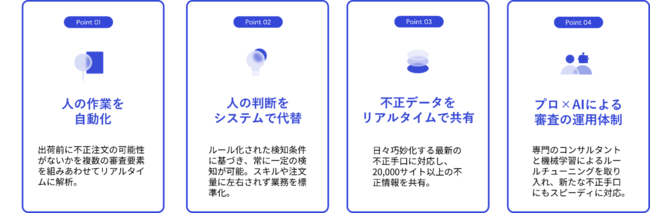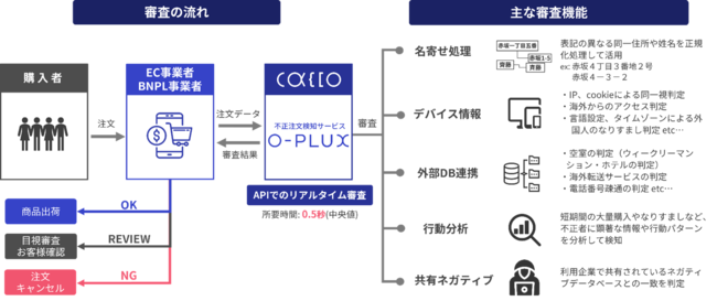 かっこが提供する不正注文検知サービス「O-PLUX」は、データサイエンスを活用した独自の審査ロジックにより、不正注文をリアルタイムに検知し、クレジットカードのなりすまし注文、不正転売・悪質転売、後払い未払い等の不正被害の防止及び審査業務の自動化を実現するクラウドサービスです。