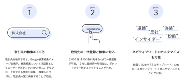 「うわさ発見」は、上場企業をはじめとするすべての事業者に求められるコンプライアンスチェックを、低コストで効率的に行うことができるクラウドサービスです。手作業では膨大な手間と時間が掛かるチェック作業を最大2,000件までまとめて一括チェックすることができ、ボタン一つで簡単にエビデンスのPDF化・保存まで行うことができます。