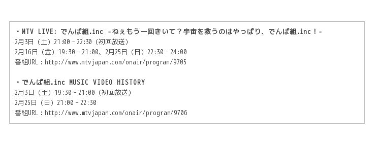 米国バイアコム社傘下のバイアコム・ネットワークス・ジャパン株式会社(所在地:東京都港区、代表取締役社長:井股 進)が運営する世界最大級のユース向け音楽&エンターテインメント・チャンネル「MTV」は、ジャパニーズポップカルチャー最先端アイドルユニット、でんぱ組.incの新体制初となる単独ライブ「ねぇもう一回きいて?宇宙を救うのはやっぱり、でんぱ組.inc!」の模様を独占でオンエアすることを決定いたしました。