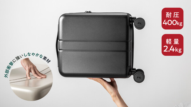 軽さ、強度、しなやかさを兼ね備えたドイツ製のポリカーボネート素材を採用。 面耐圧テストで400kgの圧力にも耐える強さと、2.4kgの軽量ボディーを実現しました。女性やお子様でも簡単に持ち上げられる軽さです。
