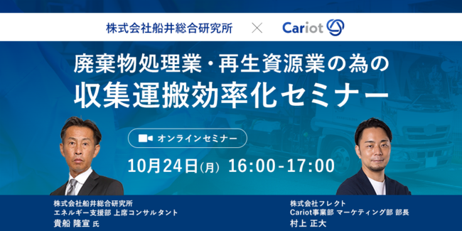 株式会社フレクト(本社:東京都港区、代表取締役CEO:黒川 幸治、以下フレクト)は、株式会社船井総合研究所(本社:大阪市中央区、代表取締役:真貝 大介、以下船井総研)の上席コンサルタント貴船 隆宣氏をゲストに招き、オンラインセミナー「廃棄物処理業・再生資源業の為の収集運搬効率化セミナー」を2022年10月24日(月)に開催します。このセミナーでは主に廃棄物処理業・再生資源業の主に経営層の方を対象に、効率改善のヒントから実際の事例を交えてご紹介します。