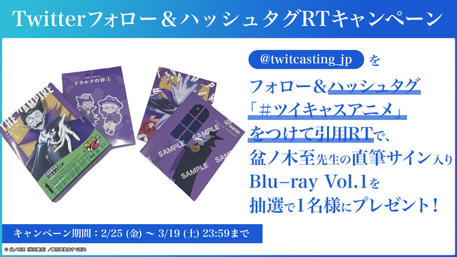 ツイキャス公式Twitterアカウント(@twitcasting_jp)のキャンペーンツイートにハッシュタグをつけてRTした人の中から抽選で1名さまにTVアニメ「吸血鬼すぐ死ぬ」原作者・盆ノ木至先生のサイン入りBlu-ray vol.1 が当たるプレゼントキャンペーンを実施いたします。