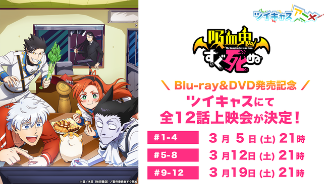 今回、ツイキャスアニメでは、TVアニメ「吸血鬼すぐ死ぬ」のBD発売を記念して、BD vol.1 から vol.3 に収録の、第1話から第12話までを3週連続で放送いたします。
