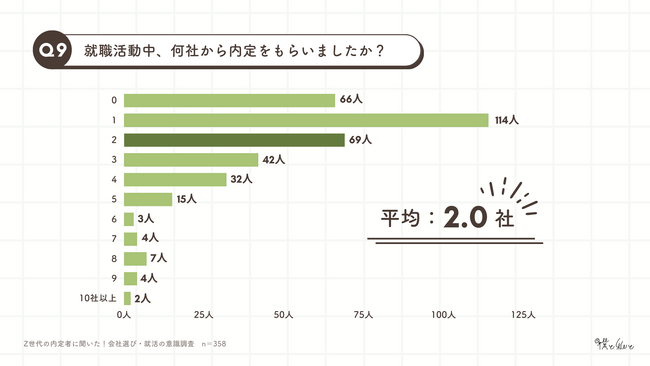 Z世代の内定社数は、「1社のみ」がもっとも多く、平均すると「2.0社」となりました。8〜10社以上という強者もいる一方で、ある程度入りたい会社を絞って選考に望んでいるZ世代が一般的のように見られました。