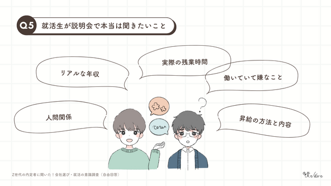 続いて、就活生が説明会で聞きたい内容を調査したところ、「リアルな年収」「人間関係」「実際の残業時間」「働いていて嫌なこと」「昇給の方法と内容」など、企業サイトには載っていないリアルな働き方や、社員の本音を求める声が多く挙がりました。