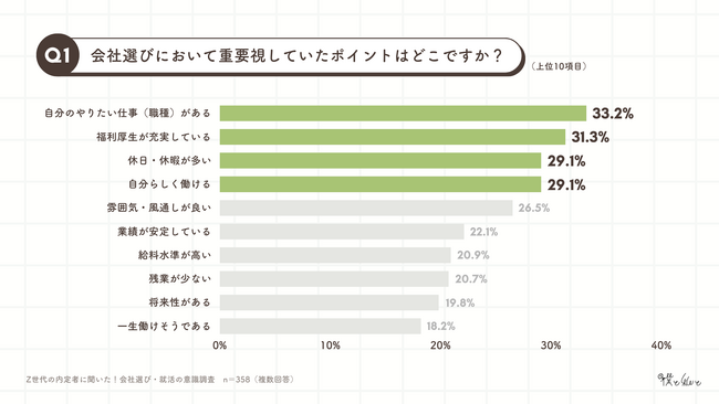 就活中に、会社選びにおいて重要視していたポイントを複数回答で聞いたところ、「自分のやりたい仕事(職種)がある(33.2%)」が1位となりました。