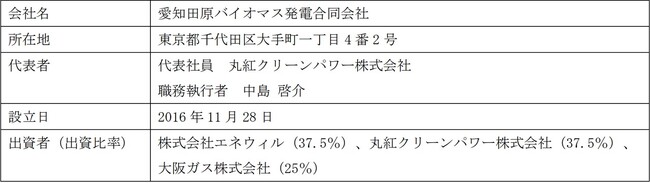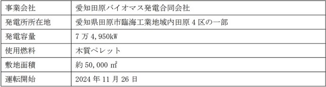 本発電所は愛知県田原市の臨海工業地域に位置し、燃料に木質ペレットを用いる発電容量約7.5万kWのバイオマス専焼発電所です。本発電所の建設および運営を担う愛知田原バイオマス発電合同会社には、エネウィルが37.5%、丸紅クリーンパワーが37.5%、大阪ガスが25%の出資をしています。
