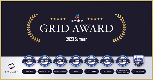 「テクノロジーで、人と企業が高め合う関係を作る」をミッションに、CRO(コンバージョン率最適化)のためのプラットフォームを提供する株式会社Sprocket(本社:東京都品川区、代表取締役:深田 浩嗣)は、アイティクラウド株式会社が運営するIT製品レビュープラットフォーム「ITreview(アイティレビュー)」の「ITreview Grid Award 2023 Summer」において、「Web接客」「ABテストツール」「ヒートマップツール」「EFO(エントリーフォーム最適化)」「アプリ解析」「オンボーディング・デジタルアダプション」「LPOツール」の総合7部門にて最高位の「Leader」を受賞、「カゴ落ち対策」では「High Performer」を受賞いたしました。