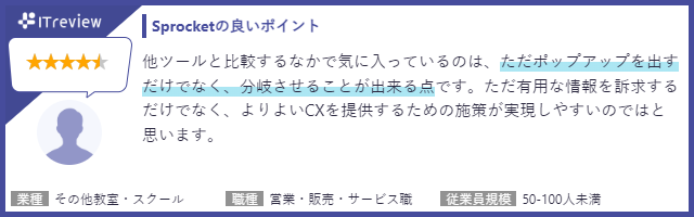 「機能面ではシナリオ分岐があるため、より丁寧なご案内ができる」「コンサルティングの方に企画提案から設計・公開・検証・再提案までお任せしているので、接客ツールを自社サイトに取り込むことができた」「管理画面上でのABテスト結果もシンプルで分かりやすい」などの評価をいただいております。