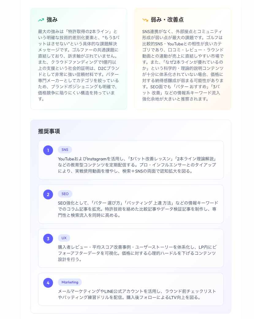 - 推奨アクション提案(SNS・SEO・UX・マーケティングの各領域別に具体的施策を提示)