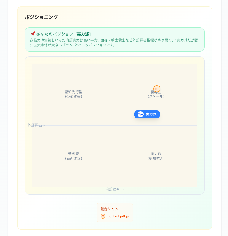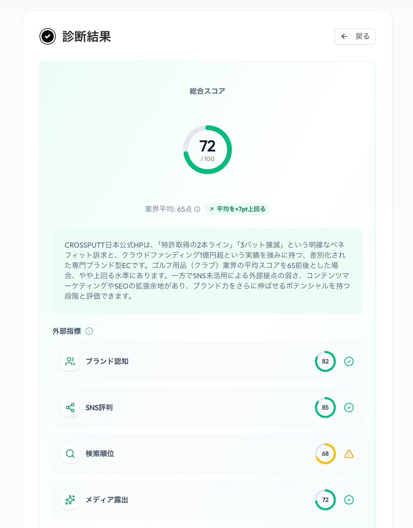 同業・近接ジャンルの競合ブランドと自社を比較し、強み・差異・立ち位置を相対的に整理します。競合各社のサイトスコアや外部評価指標を横並びで確認できるほか、「強み・改善点」の整理と「推奨アクション」も自動で出力されます。