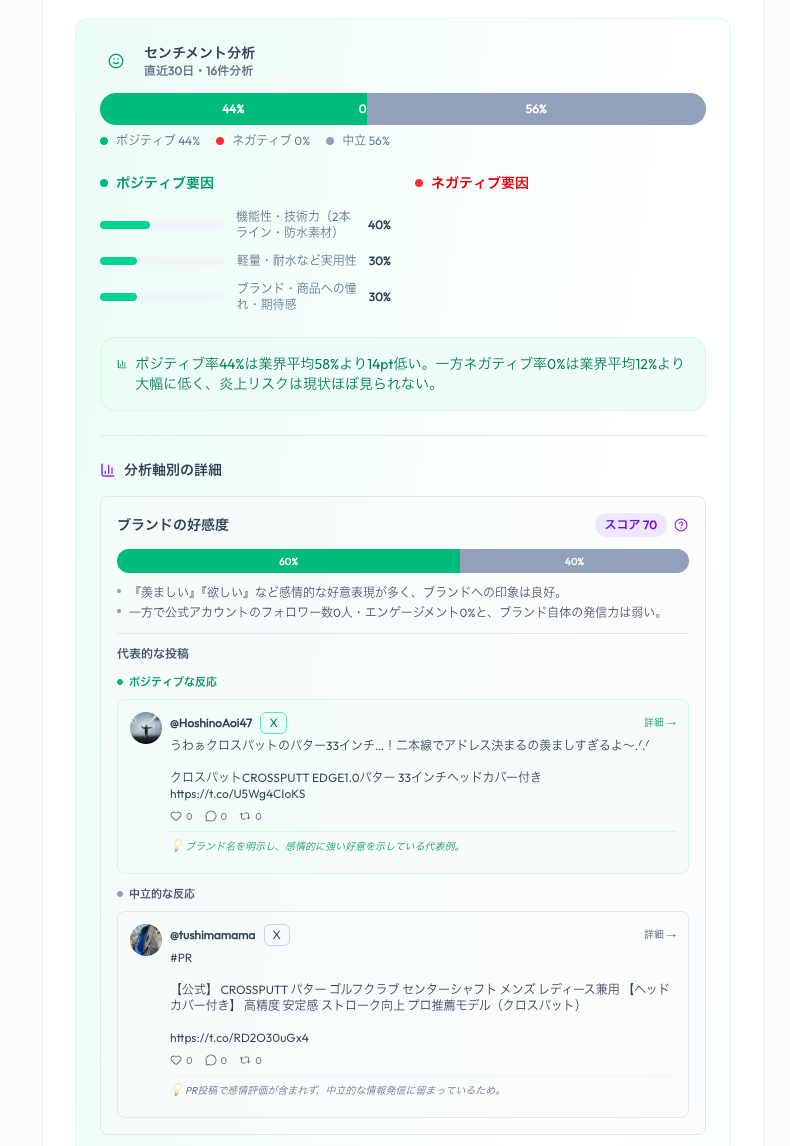 Instagram・X(旧Twitter)上の公開投稿をAIが解析し、ブランドに対するユーザーの反応傾向を可視化します。ポジティブ・ネガティブ・中立の比率に加え、その背景にある感情的要因(機能性への評価、購入体験への言及、ブランドへの親近感など)も整理されます。