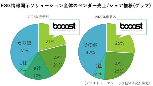 Sustainability Techカンパニーのbooost technologies株式会社(東京都品川区、代表取締役:青井宏憲 以下 当社)が開発運営を行う、サステナビリティ経営を加速するためのプラットフォーム「booost Sustainability Cloud(booost GX)」は、デロイト トーマツ ミック経済研究所株式会社(東京都千代田区、代表取締役社長:有賀章)の発行する市場調査レポート、「環境経営を推進するESG情報開示ソリューション市場動向」において、ESG情報開示およびGHG排出量可視化ソリューションの売上シェアNo.1*を獲得しました。