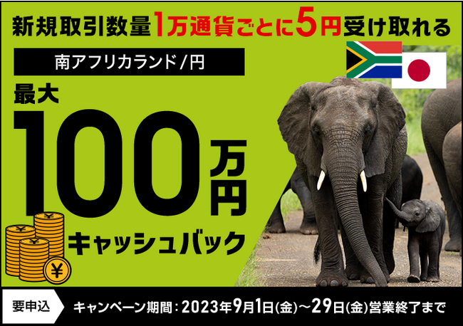 セントラル短資FX株式会社(本社:東京都中央区、代表取締役社長:宮下 俊郎)は、2023年9月1日から29日まで、南アフリカランド/円の新規取引を対象としたキャッシュバックキャンペーンを実施します。