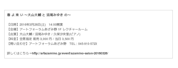 大山大輔と沼尾みゆきが、アートフォーラムあざみ野で一緒に「春」を歌います。