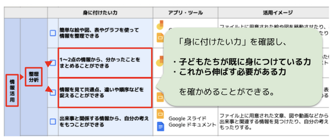 このように、特定の情報活用能力を身に付けるためには「どのようなツールやアプリケーションを取り入れ」「どういった学習活動で」「どう活用するか」を活用表に沿って実践いただくことで、日常の学習活動の中で着実に情報活用能力を育成することが可能になります。