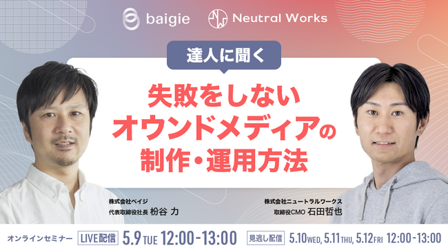 5月9日、株式会社ニュートラルワークス(神奈川県茅ヶ崎市 代表取締役:三木五月、以下 ニュートラルワークス)は、BtoBサイトおよび業務アプリケーションのUI/UXデザインを得意とする株式会社ベイジ(東京都世田谷区 代表取締役社長:枌谷 力、以下ベイジ)と無料ウェビナー「達人に聞く『失敗をしないオウンドメディアの制作・運用方法』」を開催いたします。