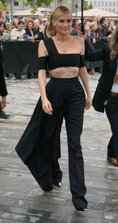 9月25日開催された第18回チューリッヒ映画祭「Marlowe」のプレミアにて、ダイアン・クルーガーが2022年秋冬コレクションより、ブラックコンパクトニットのバンデージトップとアシンメトリードレープが特徴的なブラックウールモヘアのシガレットトラウザーを着用し登場しました。